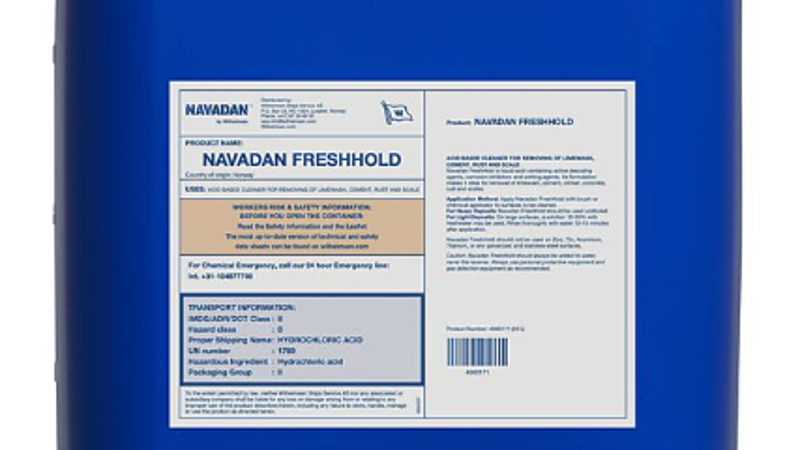 Navadan FreshHold یک اسید مایع حاوی مواد رسوب زدای فعال، مهارکننده های خوردگی و مواد مرطوب کننده است. فرمولاسیون آن را برای حذف آهک، سیمان، کلینکر، بتن، زنگ زدگی و پوسته ها ایده آل می کند. طبق ضمیمه V Marpol قابل تخلیه است.